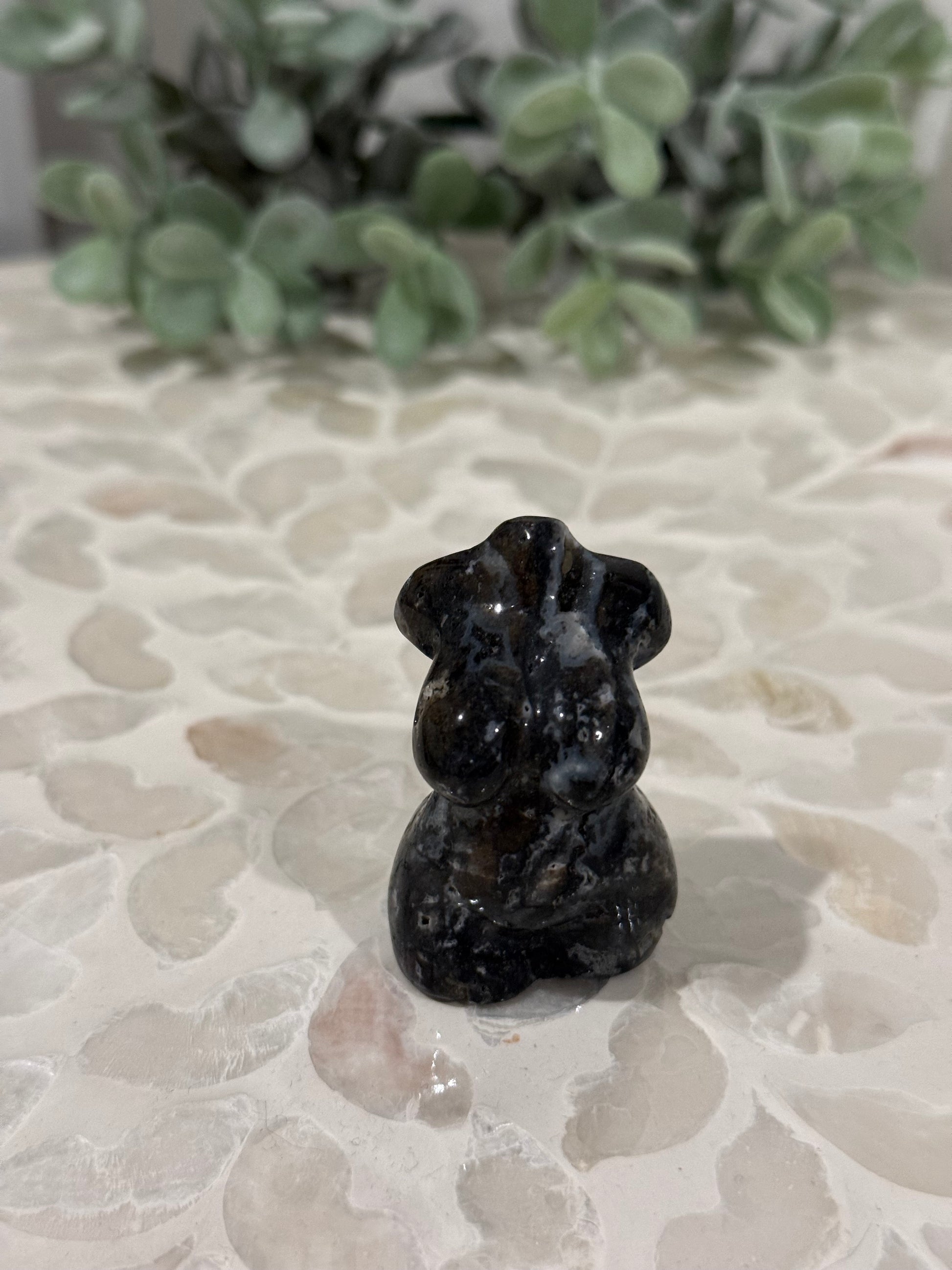 Gorgeous Moss Agate curvy goddess. Stands unaided. Has beautiful druze pockets.