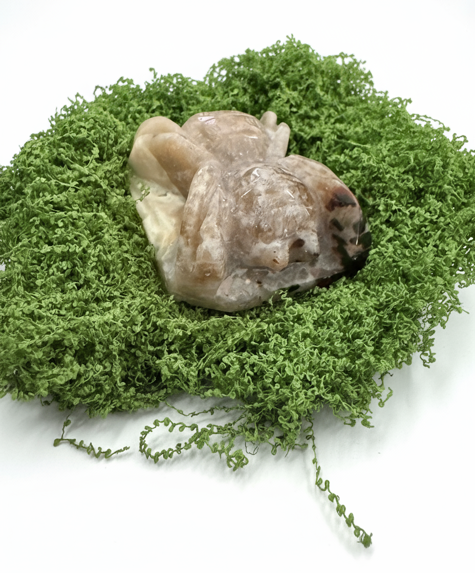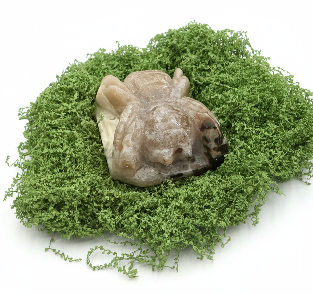 This creepy crawler is carved from Flower Agate. It is such a beautiful stone with many layers and colour variations. Its name given to it due to its flower like plumes that grow within the stone itself.