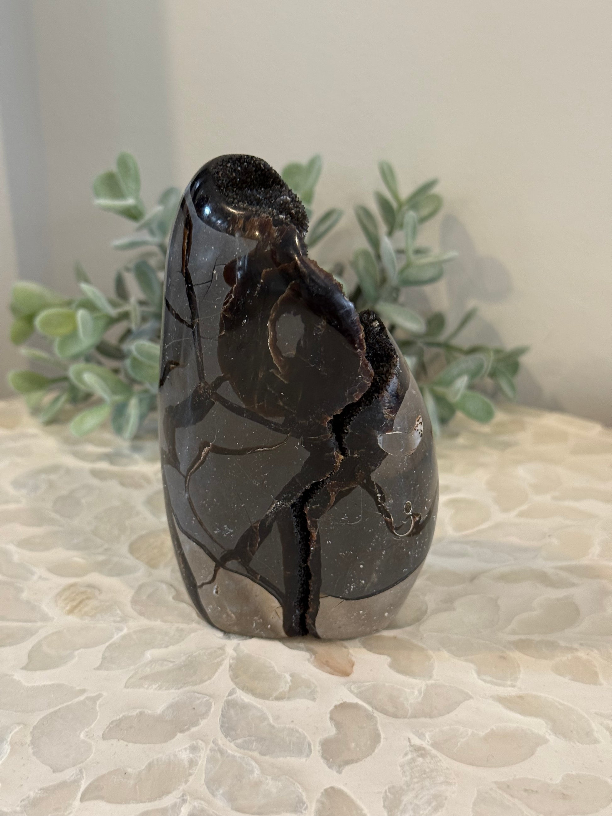 This is stunning piece with such beautiful sparkle. The backside has a druzy strip running down it. Calcite growths on the front side. Gorgeous statement piece.